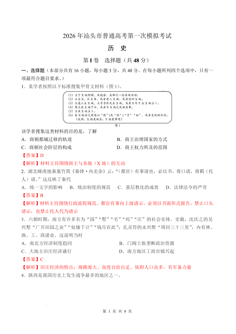 2026年汕头市普通高考第一次模拟考试 历史答案.pdf