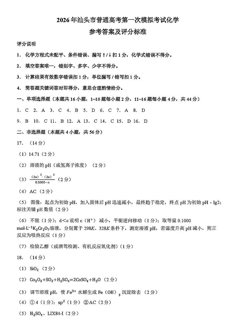 2026年汕头市普通高考第一次模拟考试 化学答案.pdf