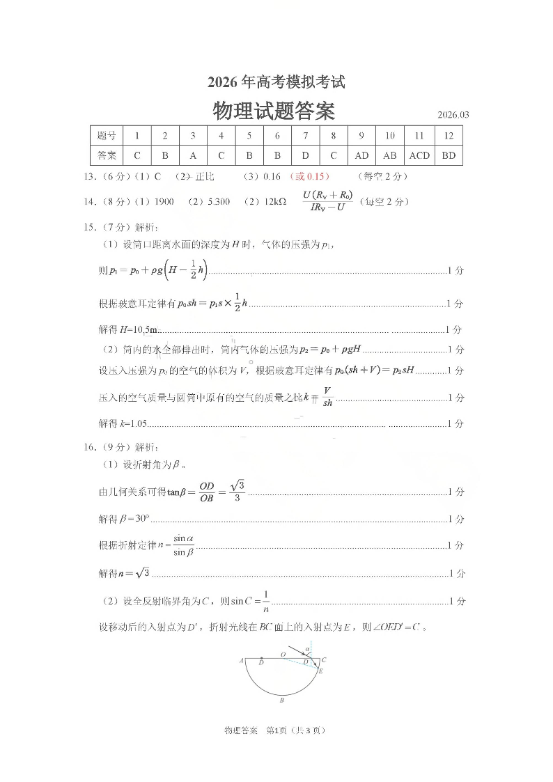 济宁市2026届高三年级一模考试 物理答案.pdf