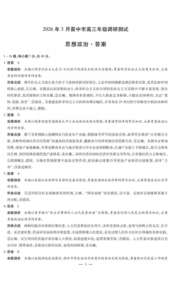 山西省晋中市2026年3月高三年级调研测试 政治答案.pdf