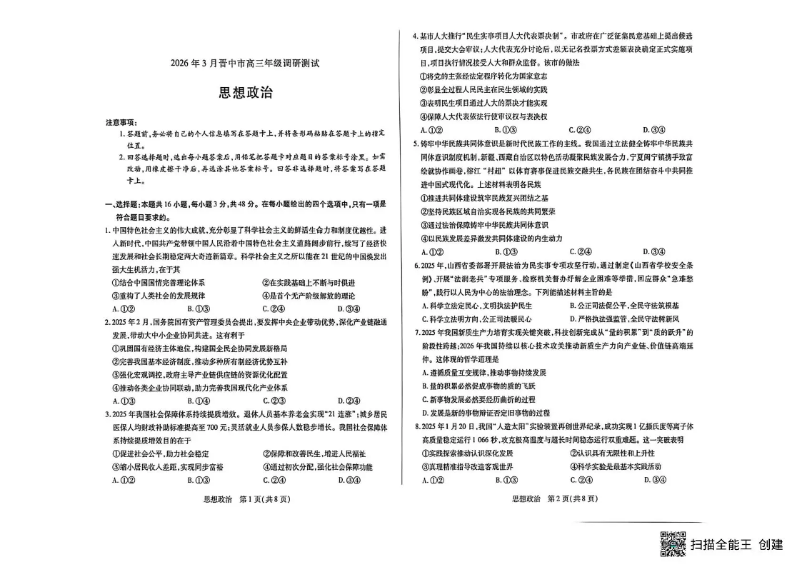 山西省晋中市2026年3月高三年级调研测试 政治.pdf