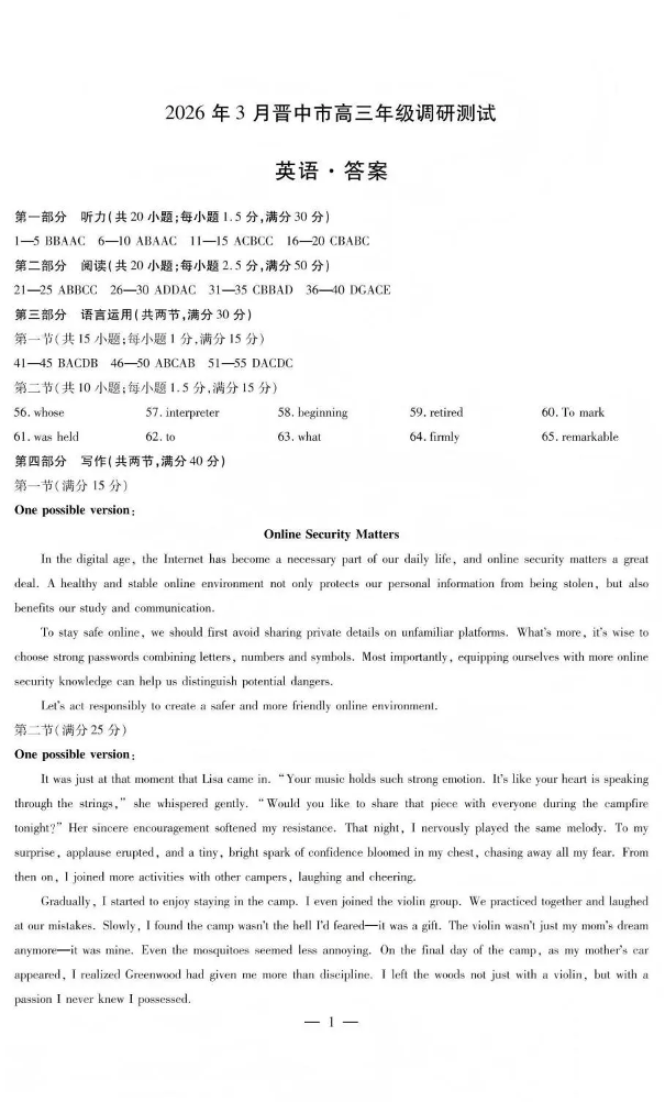 山西省晋中市2026年3月高三年级调研测试 英语答案.pdf