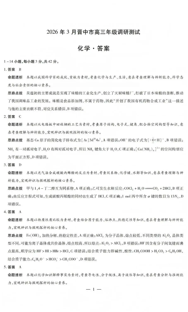 山西省晋中市2026年3月高三年级调研测试 化学答案.pdf
