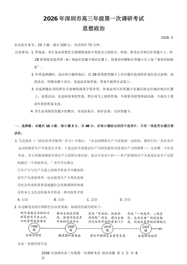 2026年深圳市高三年级第一次调研考试 政治.docx