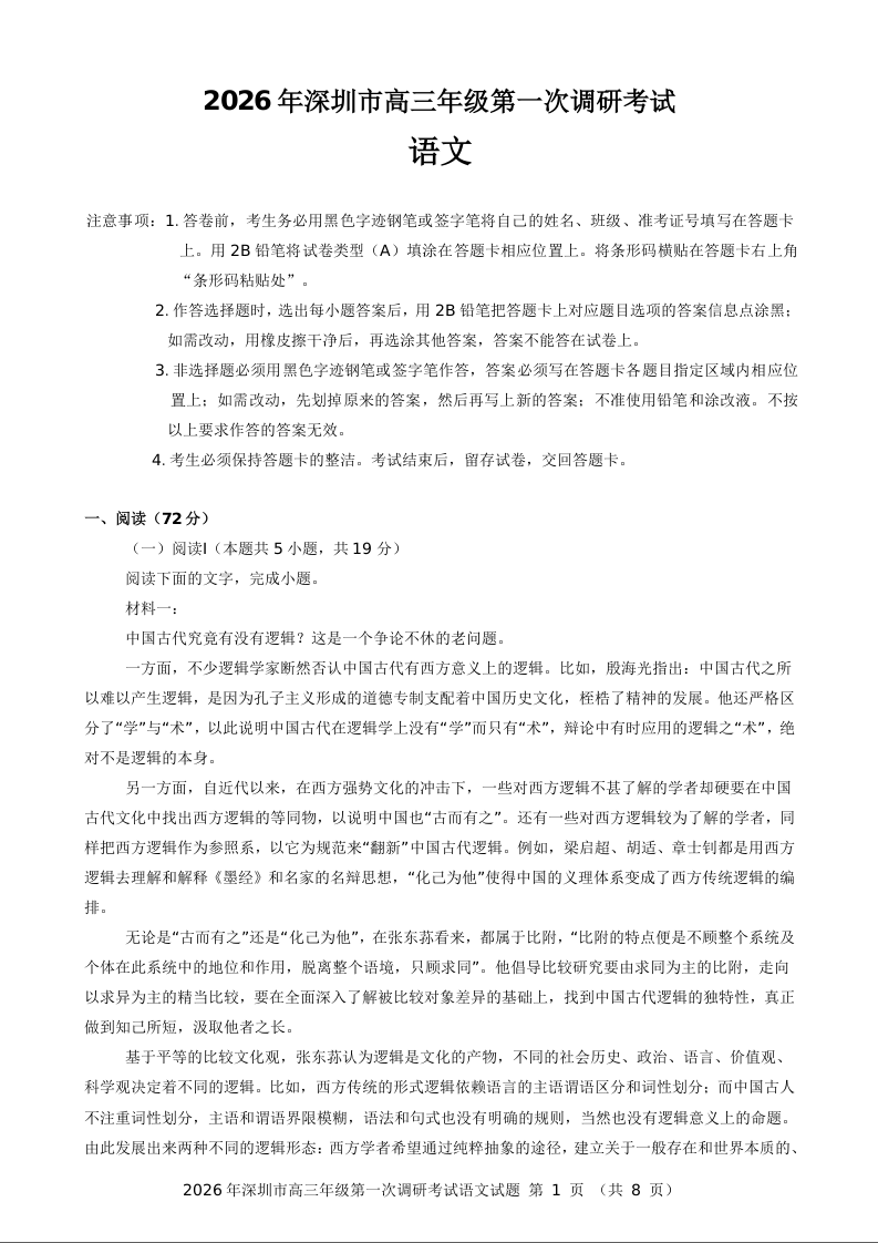 2026年深圳市高三年级第一次调研考试 语文.docx