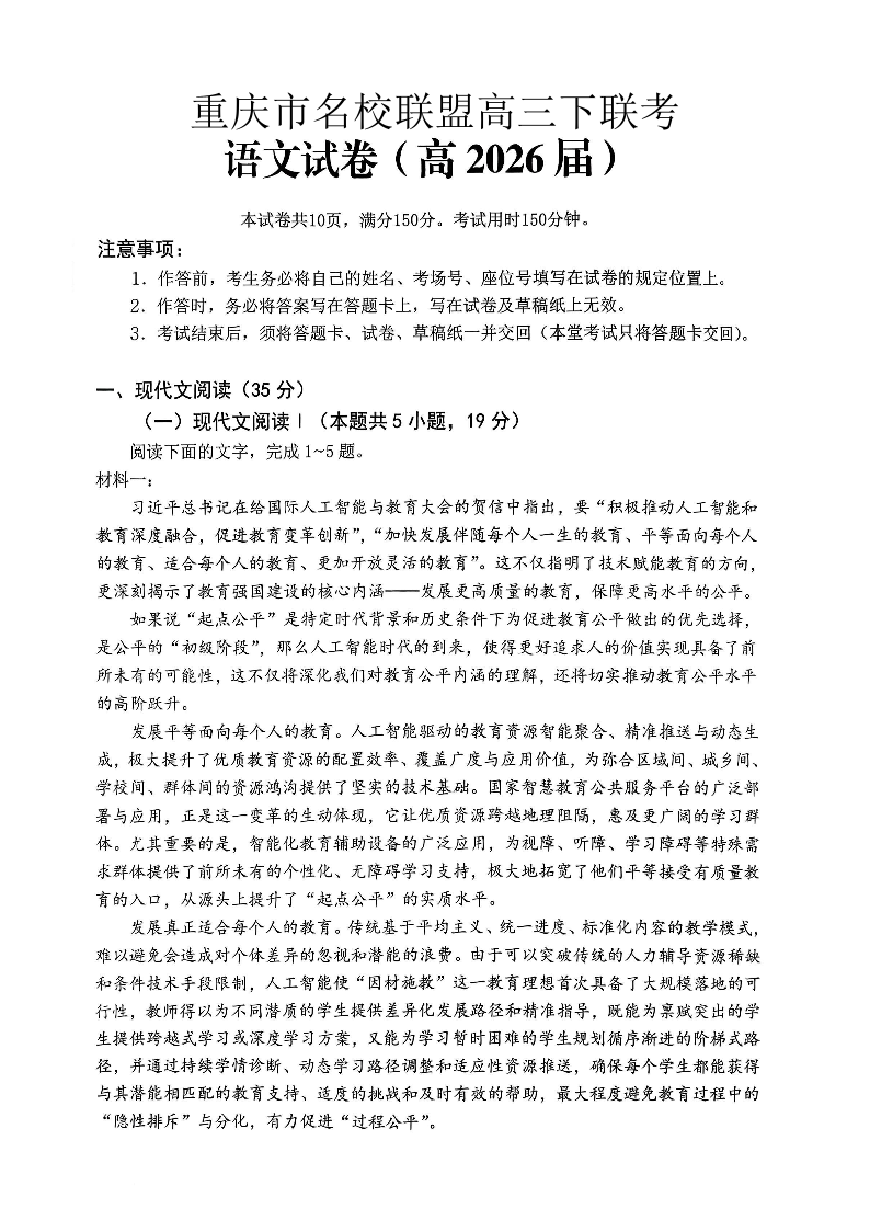 重庆名校联盟2026届高三下学期第一次联考 语文.pdf