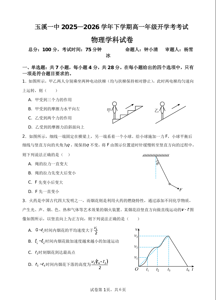 云南省玉溪市一中2025-2026学年高一下学期开学考试 物理.docx