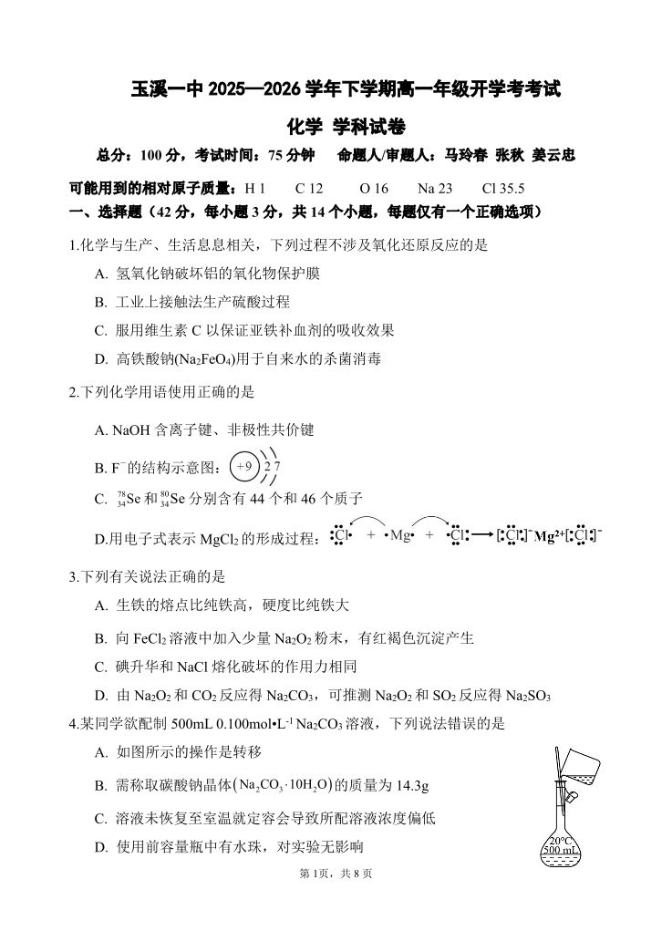云南省玉溪市一中2025-2026学年高一下学期开学考试 化学.pdf