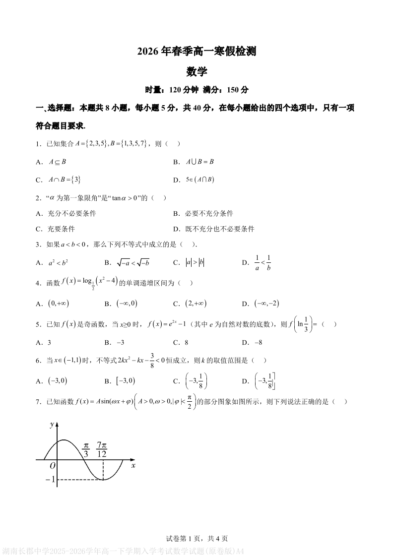 湖南省长沙市长郡中学2025-2026学年高一下学期入学考试 数学.pdf