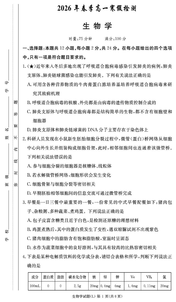 湖南省长沙市长郡中学2025-2026学年高一下学期入学考试 生物.pdf