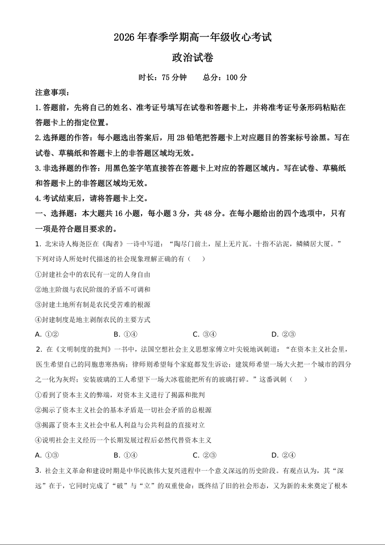 湖北省恩施高中教学联盟2025-2026学年高一下学期开学考试 政治.docx
