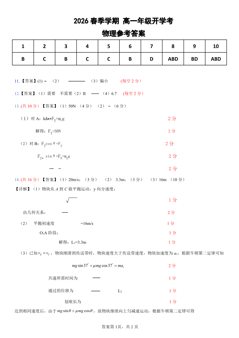 湖北省恩施高中教学联盟2025-2026学年高一下学期开学考试 物理答案.pdf