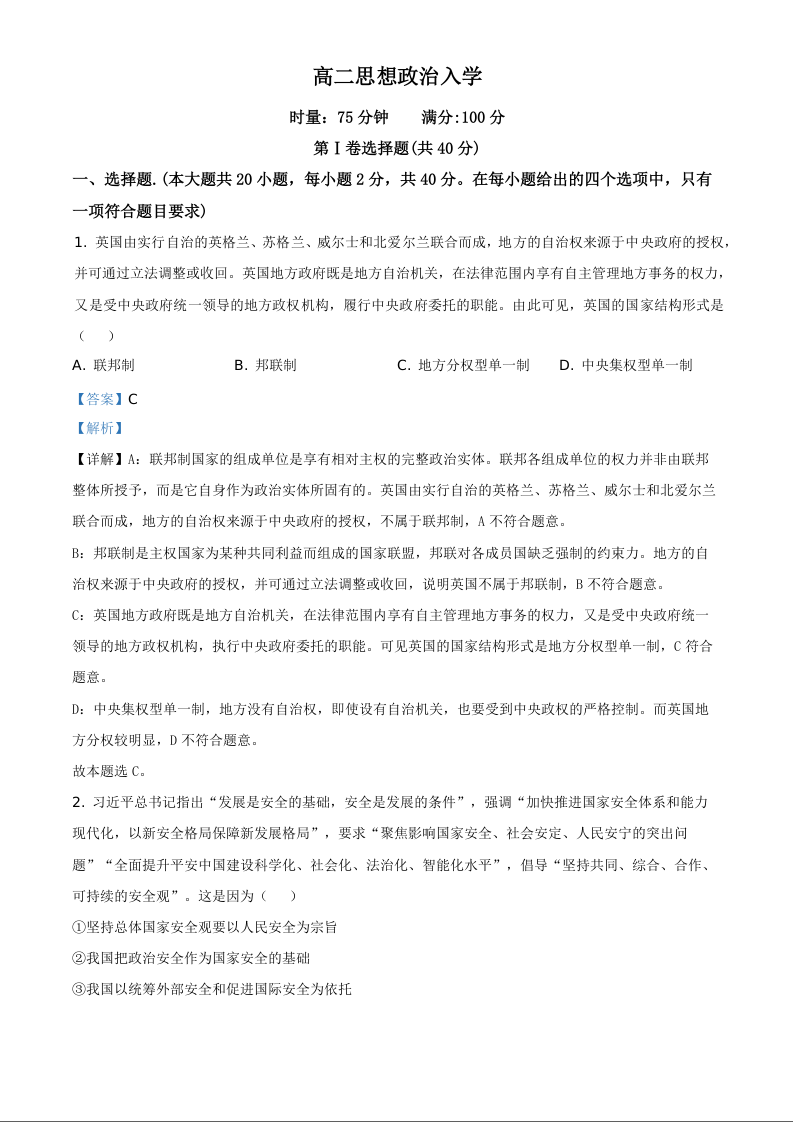 湖南省长沙市第一中学2025-2026学年高二下学期入学考试 政治答案.docx