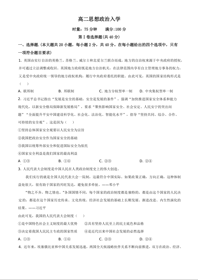 湖南省长沙市第一中学2025-2026学年高二下学期入学考试 政治.docx