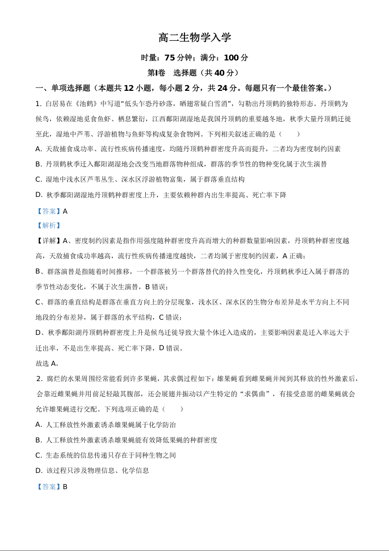 湖南省长沙市第一中学2025-2026学年高二下学期入学考试 生物答案.docx