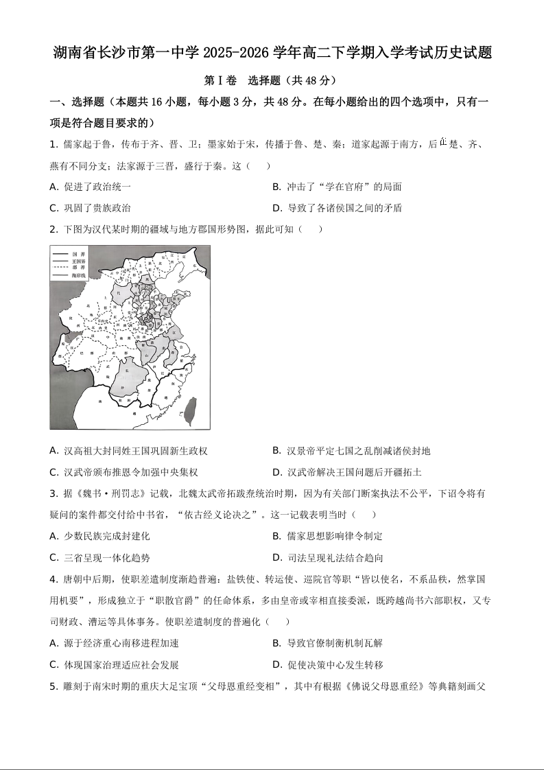 湖南省长沙市第一中学2025-2026学年高二下学期入学考试 历史.docx