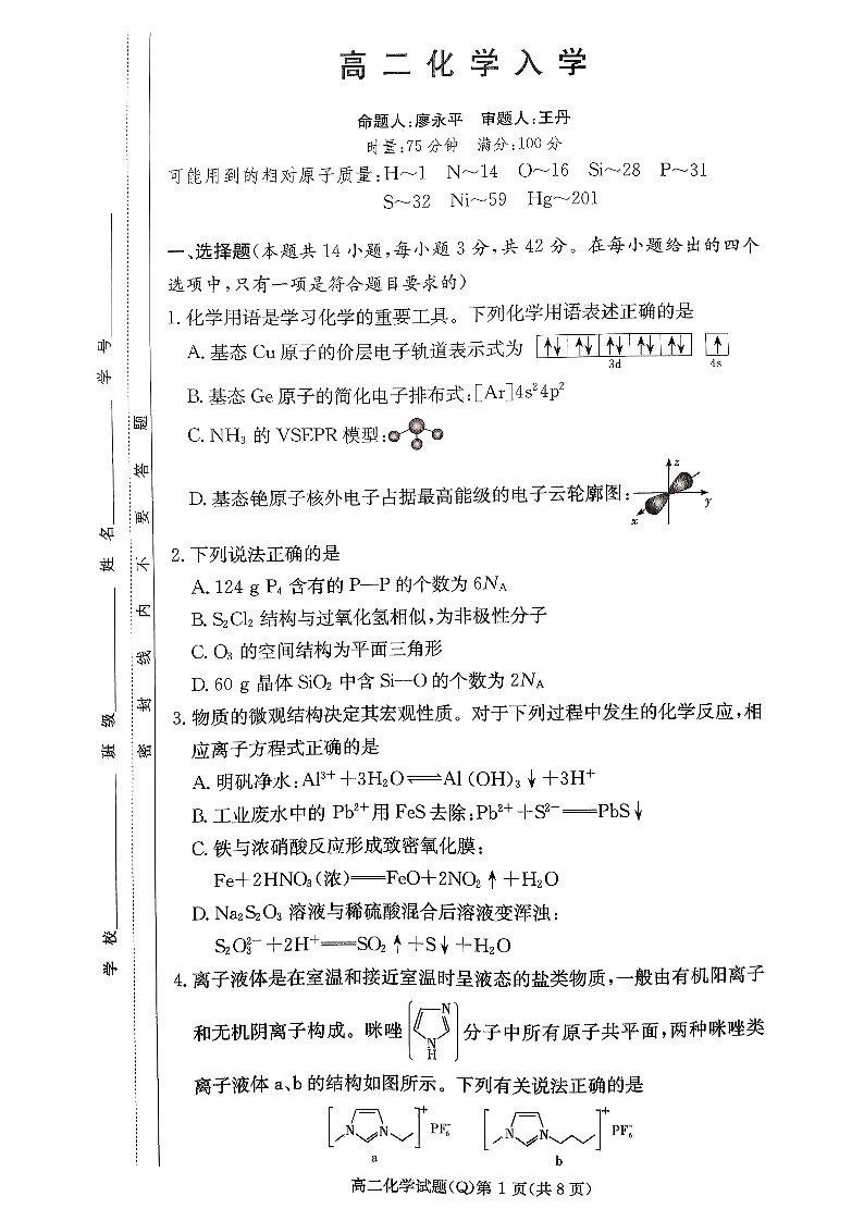 湖南省长沙市第一中学2025-2026学年高二下学期入学考试 化学试题(含答案).pdf
