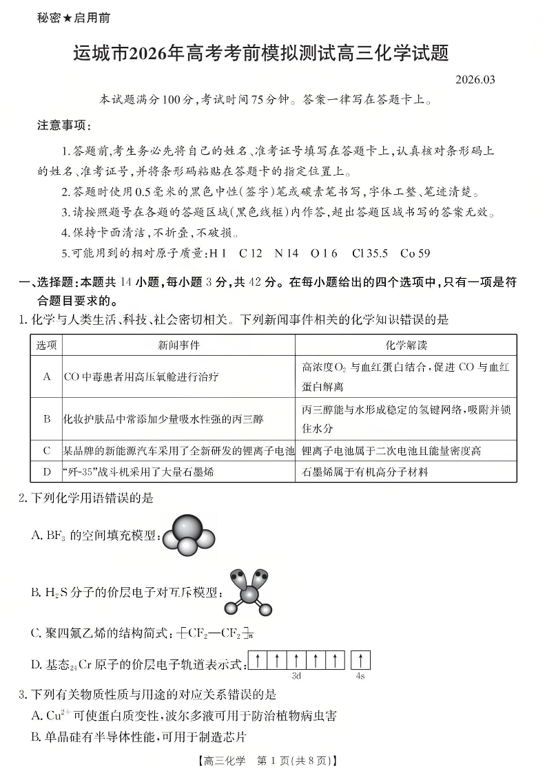 运城市2026年高考考前模拟测试 化学.pdf
