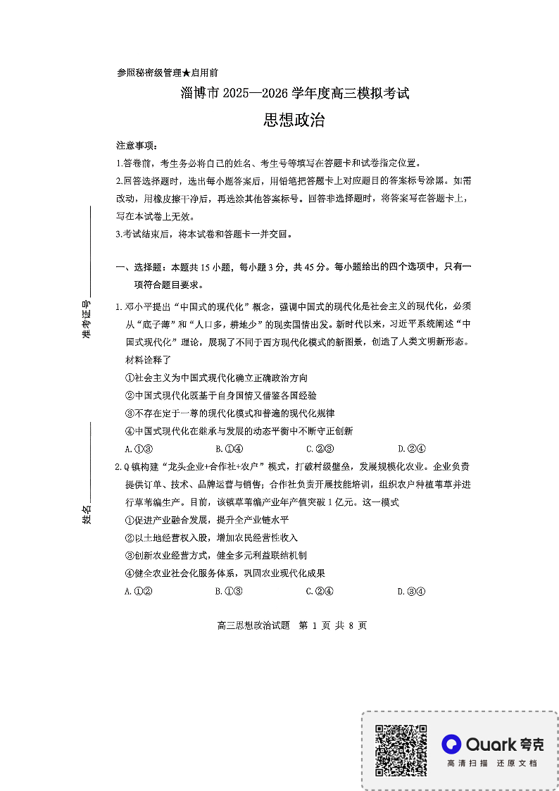 淄博市2025-2026学年度高三模拟考试 政治.pdf