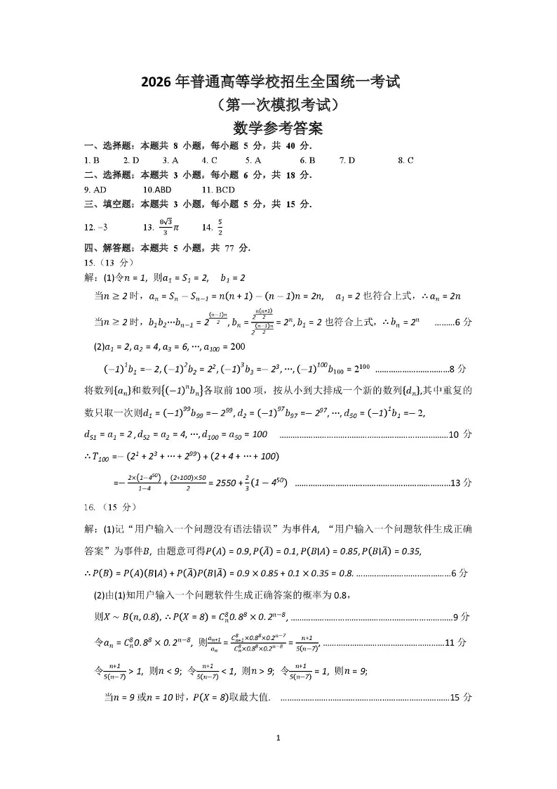 内蒙古包头市2026年高三第一次模拟考试 数学答案.pdf