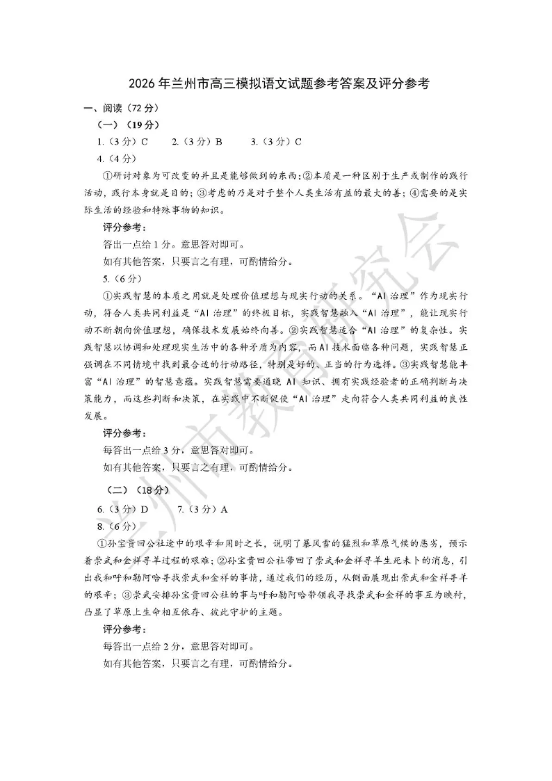 2026年兰州市高三模拟考试 语文答案.pdf
