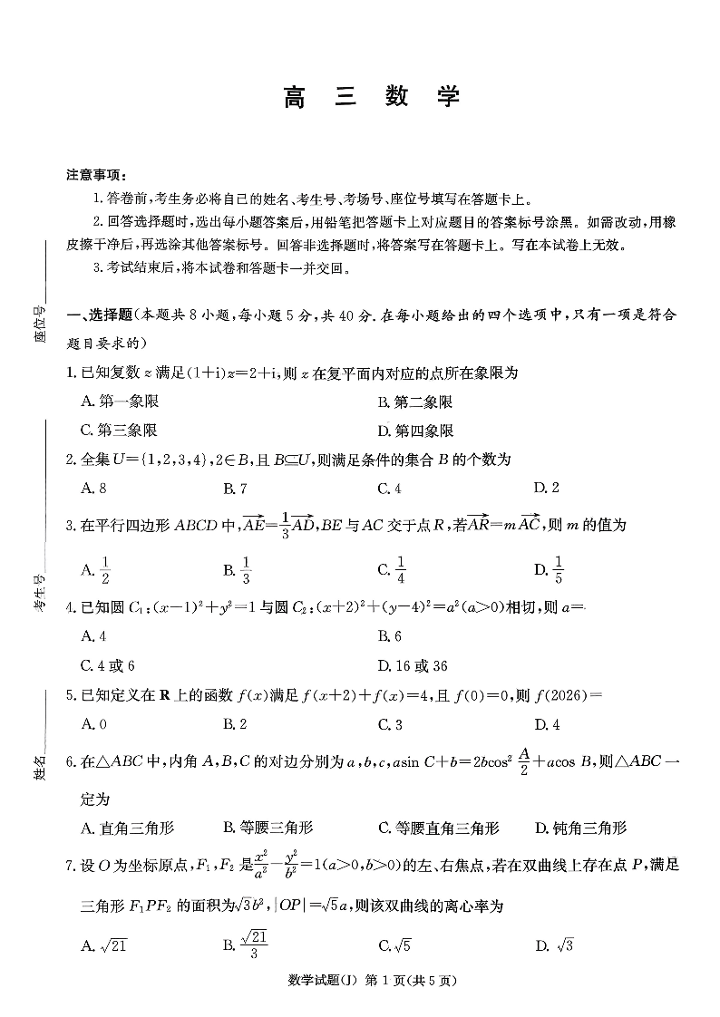 湖南省九校联盟2026届高三第二次联考(暨怀化市一模)数学.pdf