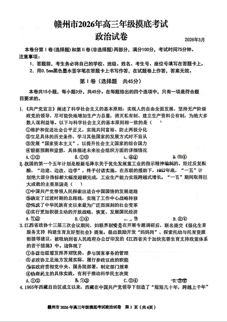 江西省赣州市2026年高三下学期3月摸底考试 政治.docx