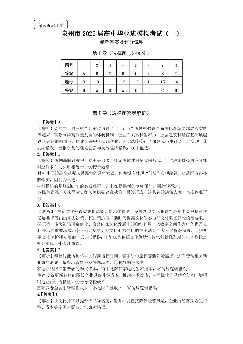 泉州市2026届高中毕业班模拟考试(一)政治答案.docx