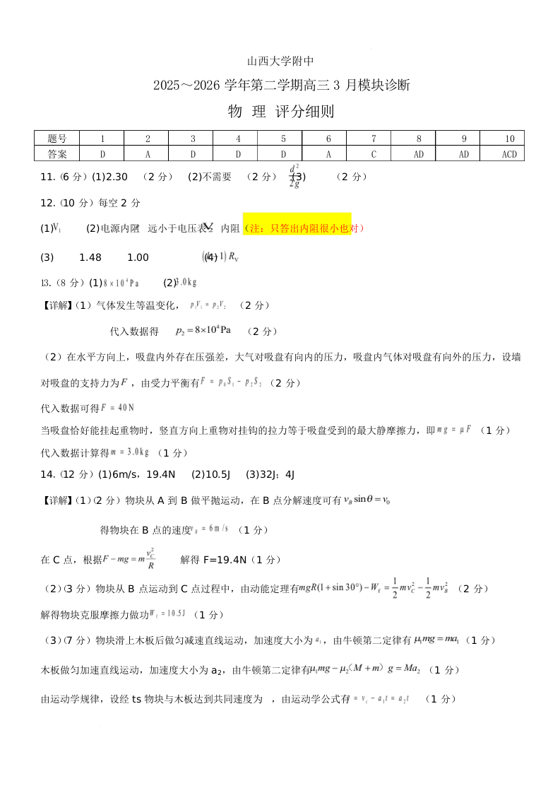 山西大学附属中学校2025-2026学年高三年级第二学期3月模块诊断 物理答案.docx