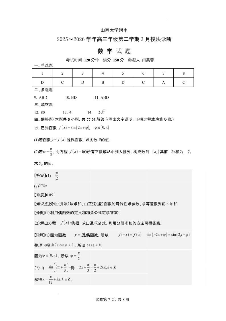 山西大学附属中学校2025-2026学年高三年级第二学期3月模块诊断 数学答案.pdf