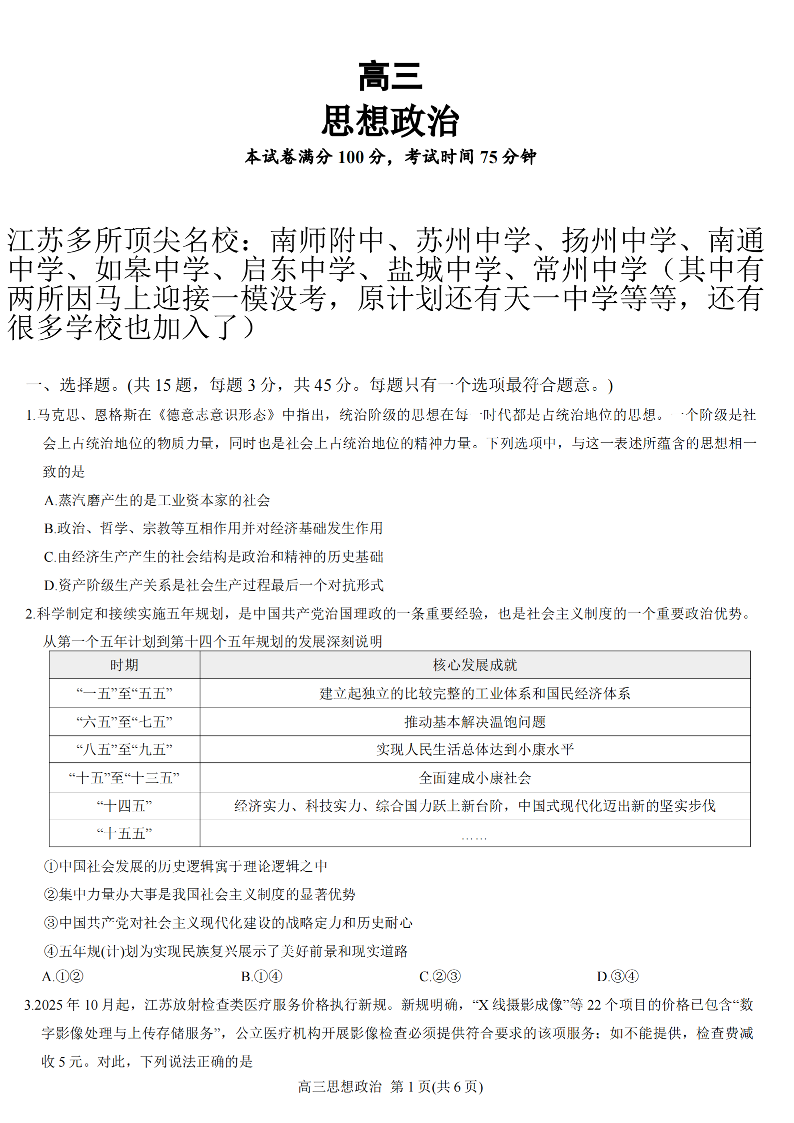 江苏省顶尖九校2026届高三年级联考 政治试题(含答案).pdf