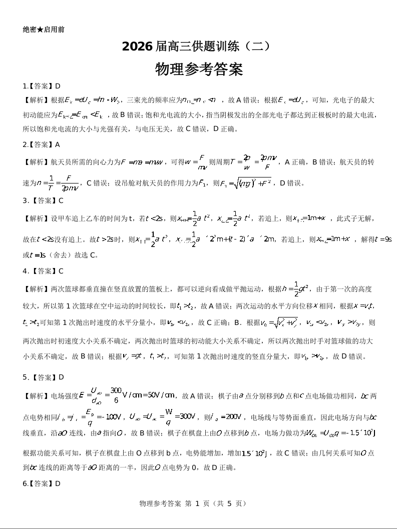 2026届高三供题训练(二)物理参考答案.docx