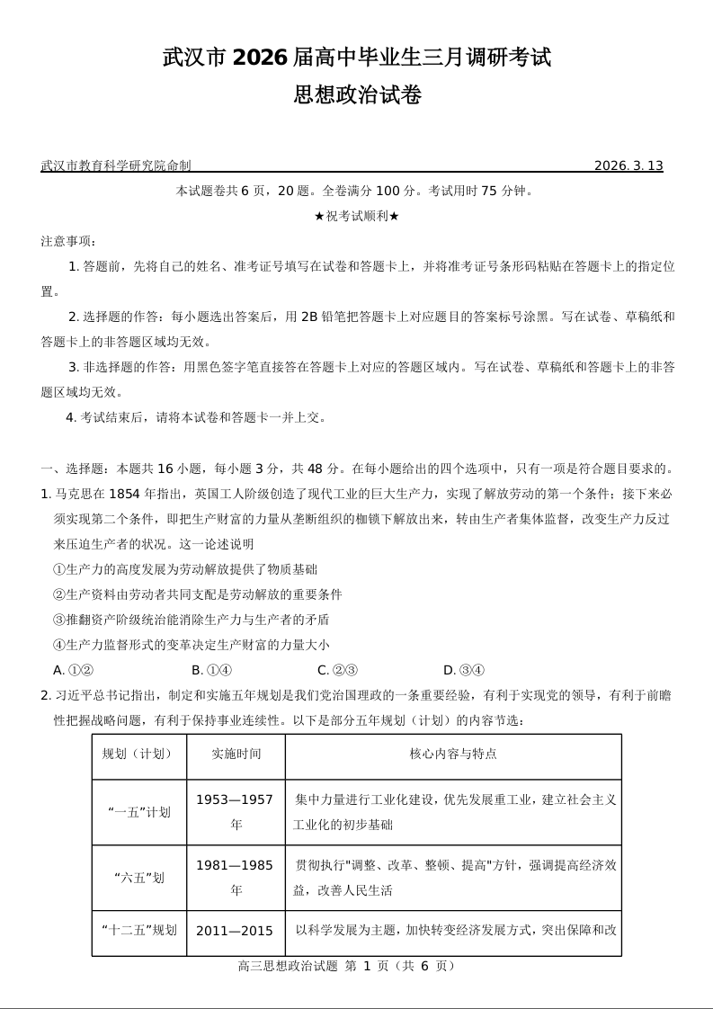 武汉市2026届高中毕业生三月调研考试 政治.docx