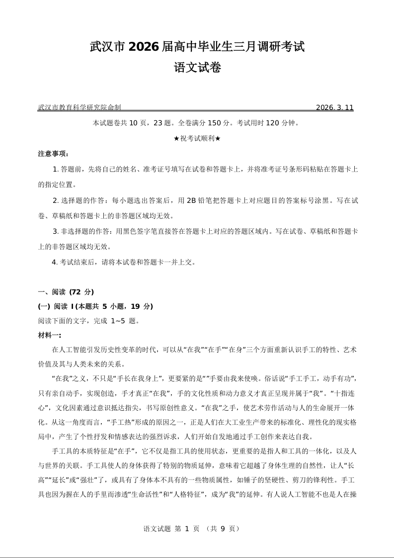 武汉市2026届高中毕业生三月调研考试 语文.doc