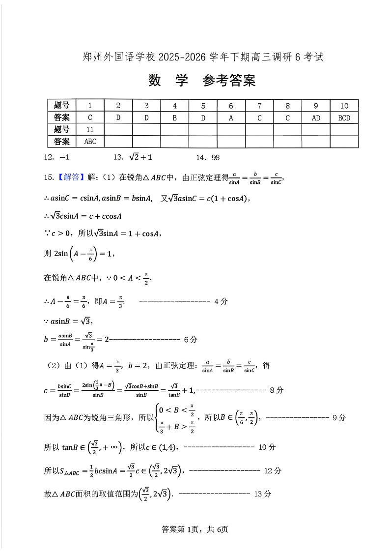 郑州外国语学校2025-2026学年下期高三调研6考试试卷 数学答案.pdf