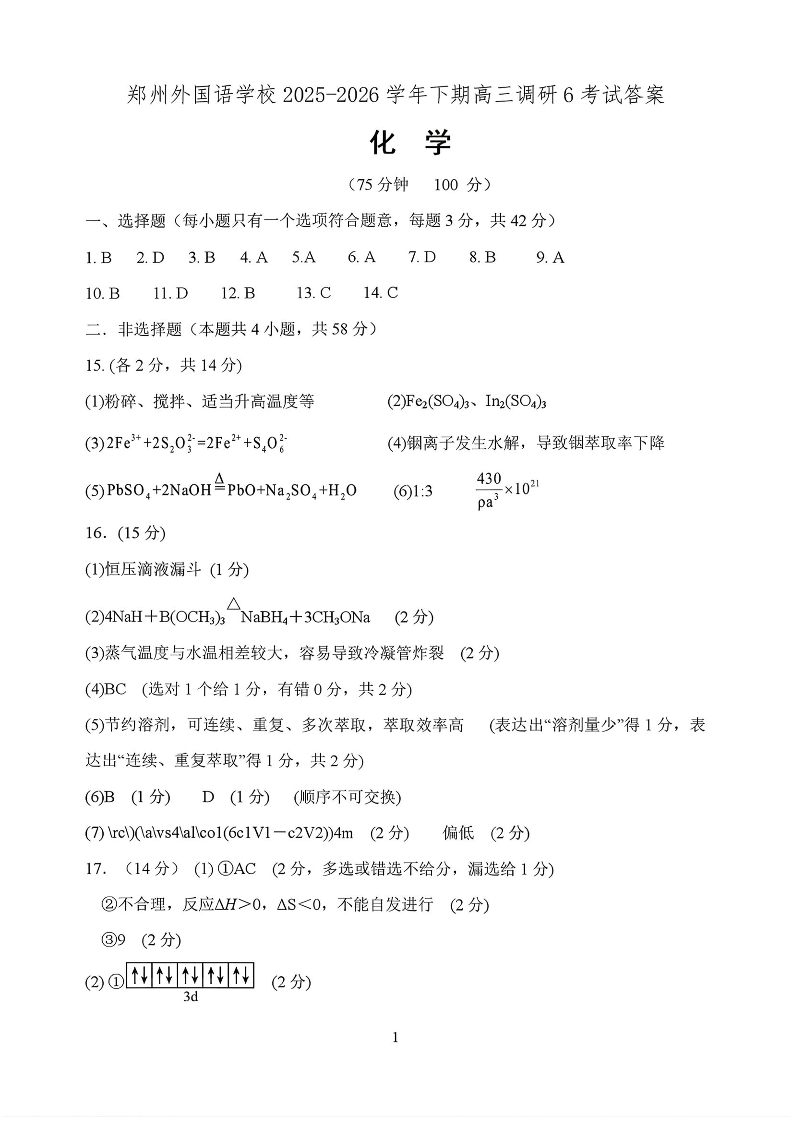 郑州外国语学校2025-2026学年下期高三调研6考试试卷 化学答案.pdf