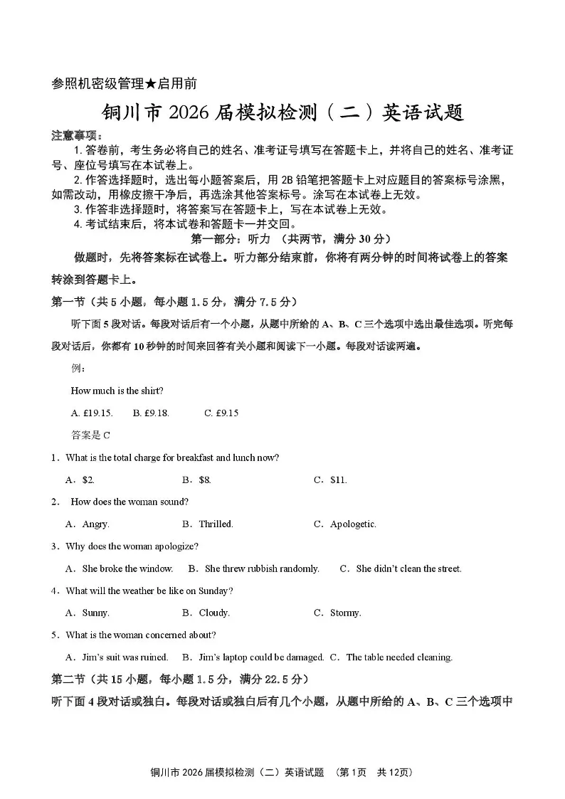 铜川市2026届模拟预测(二)英语试题(含答案).pdf