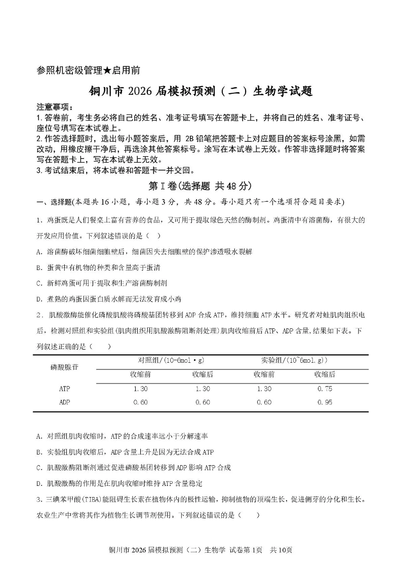 铜川市2026届模拟预测(二)生物试题(含答案).pdf