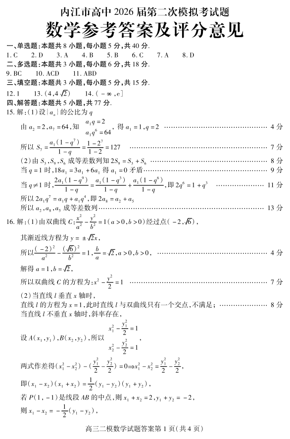 内江市高中2026届第二次模拟考试题 数学答案.pdf