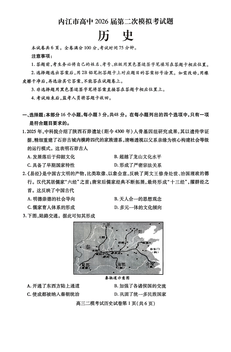 内江市高中2026届第二次模拟考试题 历史.pdf