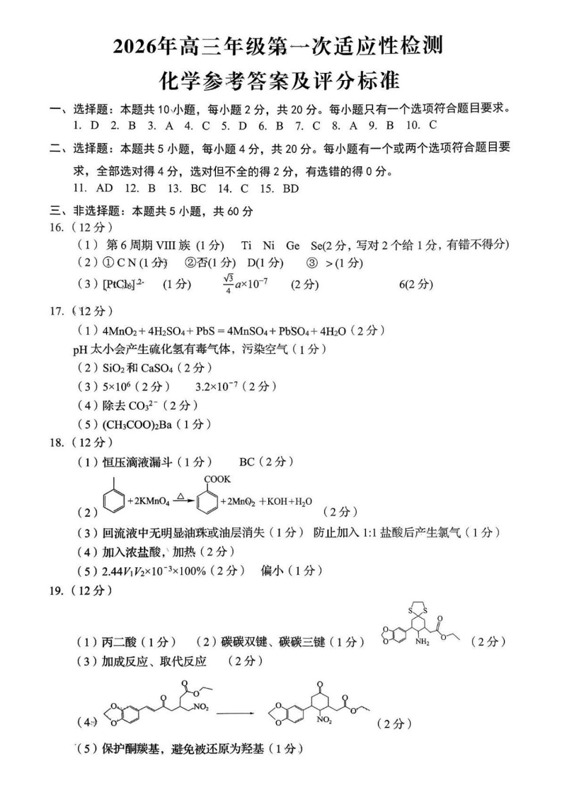 青岛市2026年高三年级第一次适应性检测 化学答案.pdf