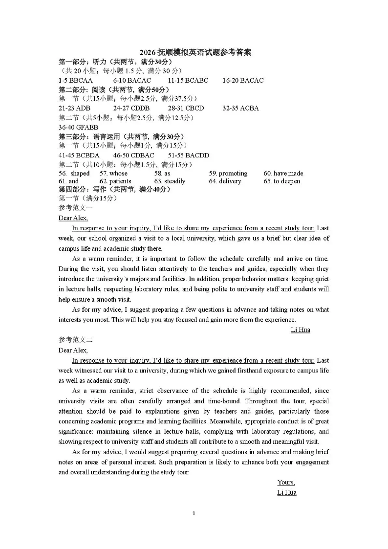 2026年抚顺市普通高中应届毕业生高考模拟考试 英语答案.pdf