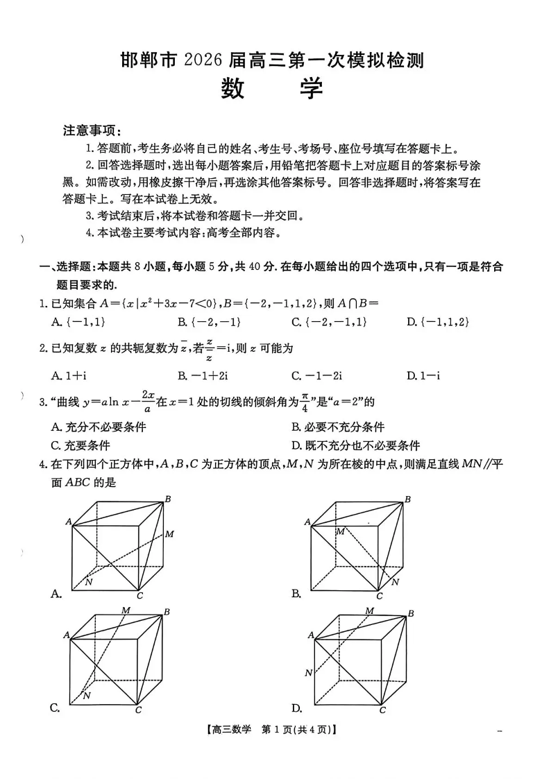 邯郸市2026届高三第一次模拟检测 数学.pdf