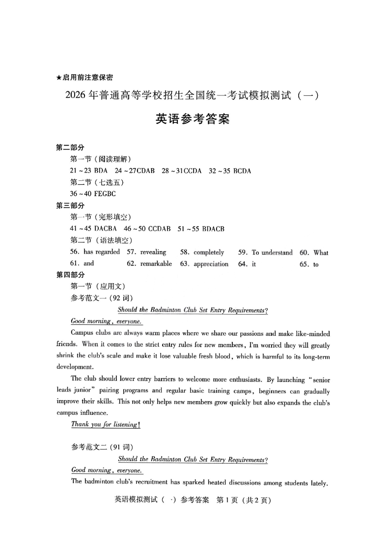 广东省2026年普通高等学校招生全国统一考试模拟测试(一)英语答案.pdf