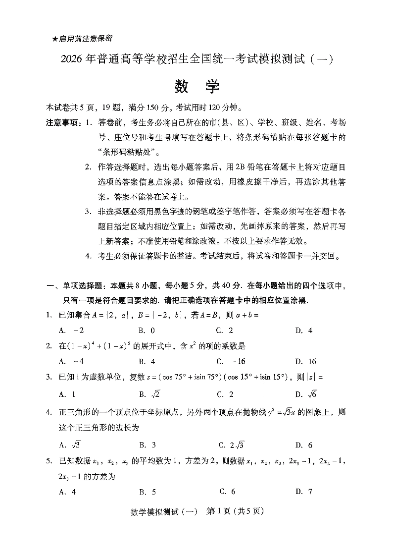 广东省2026年普通高等学校招生全国统一考试模拟测试(一)数学.pdf