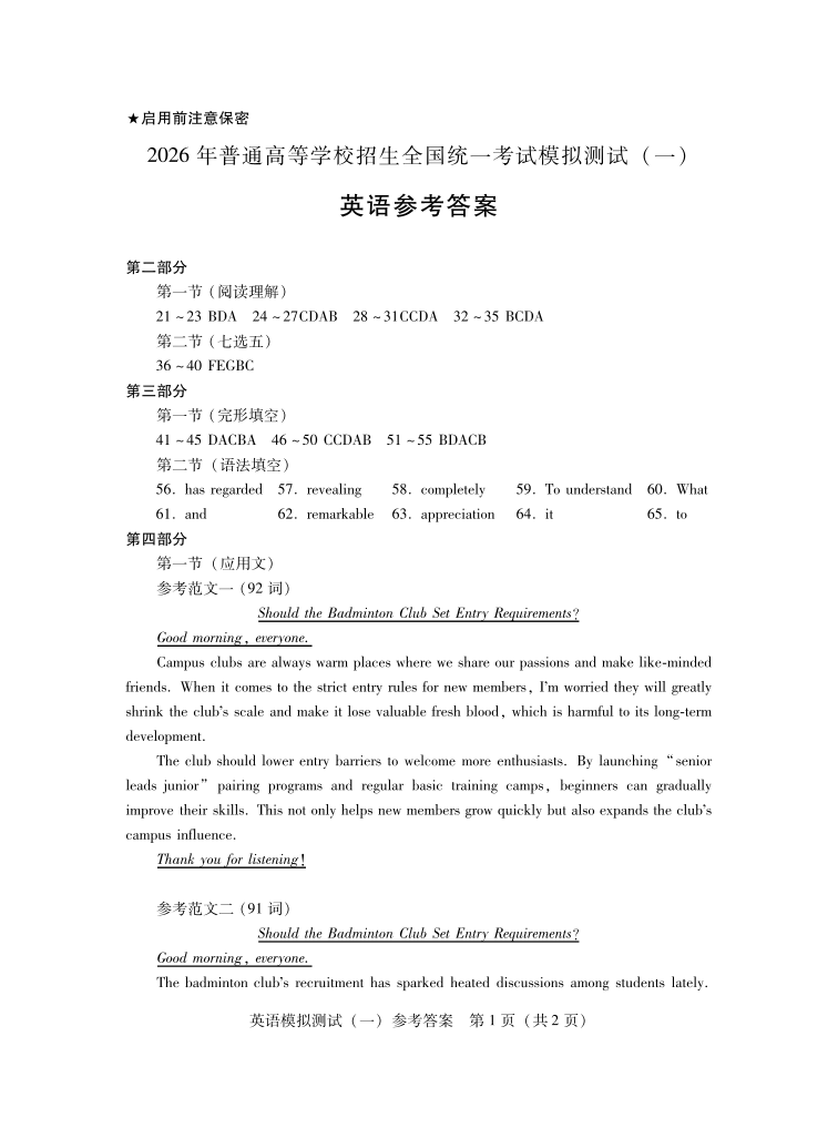 2026年普通高等学校招生全国统一考试模拟测试(一)英语答案.pdf