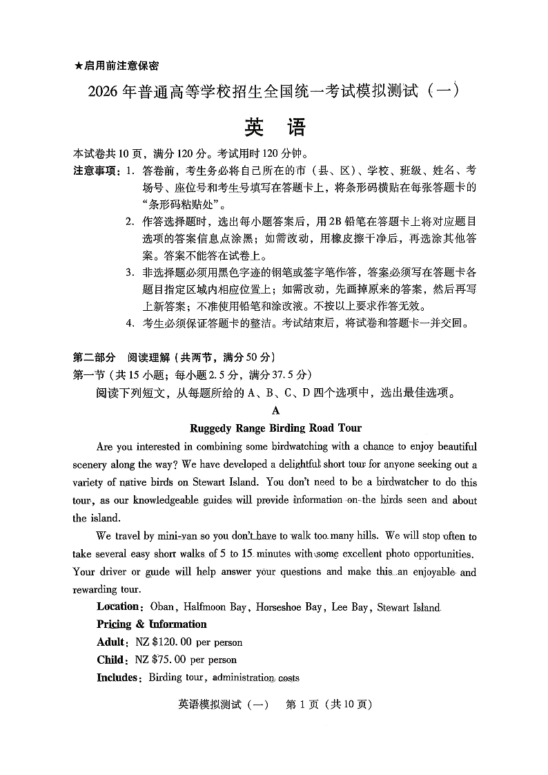 2026年普通高等学校招生全国统一考试模拟测试(一)英语.pdf