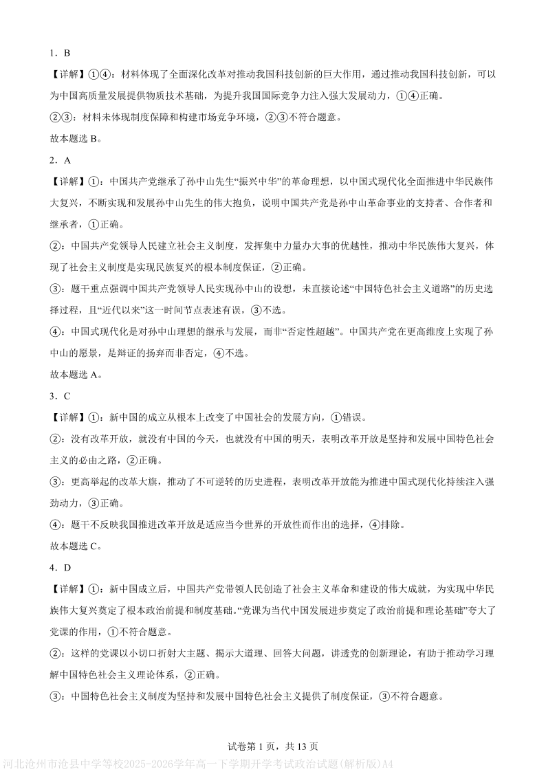 沧州市名校联考2025-2026学年高一下学期开学考试 政治答案.pdf