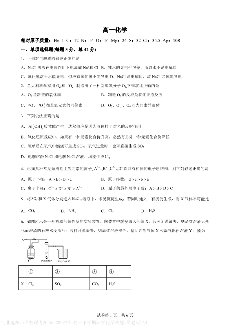 沧州市名校联考2025-2026学年高一下学期开学考试 化学.pdf