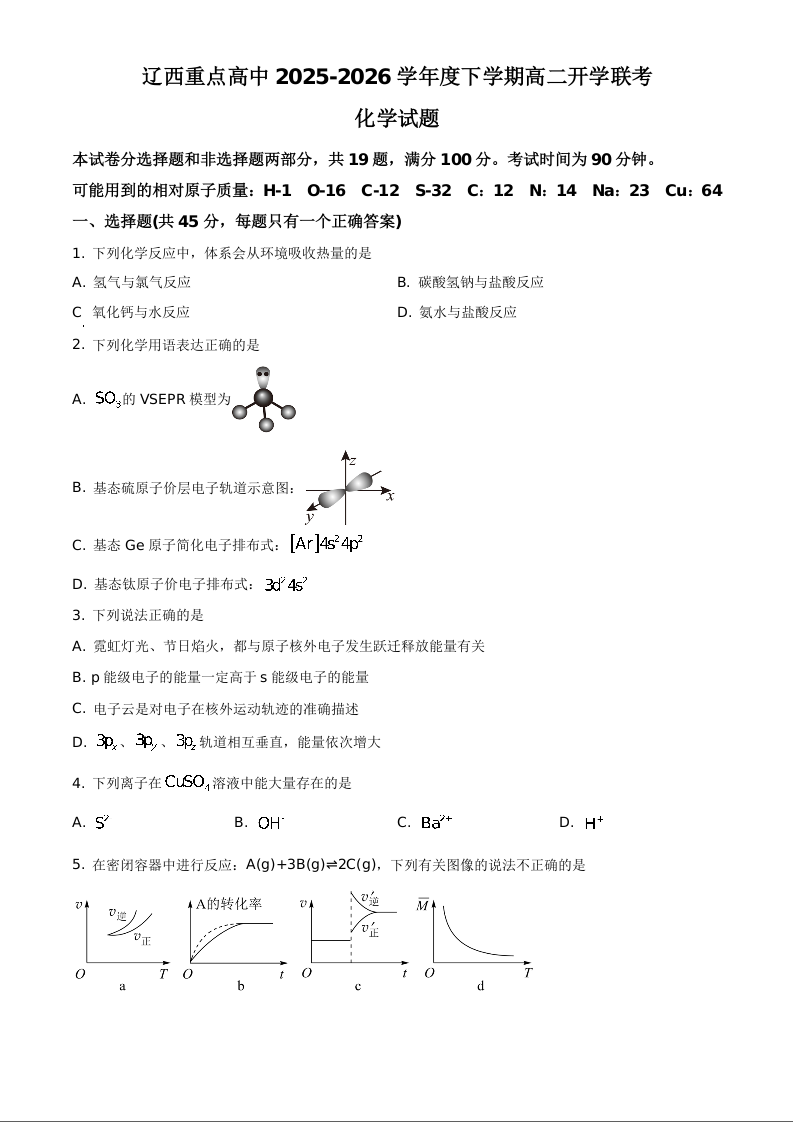 辽宁省辽西重点高中2025-2026学年高二下学期开学联考 化学.docx